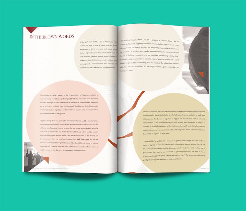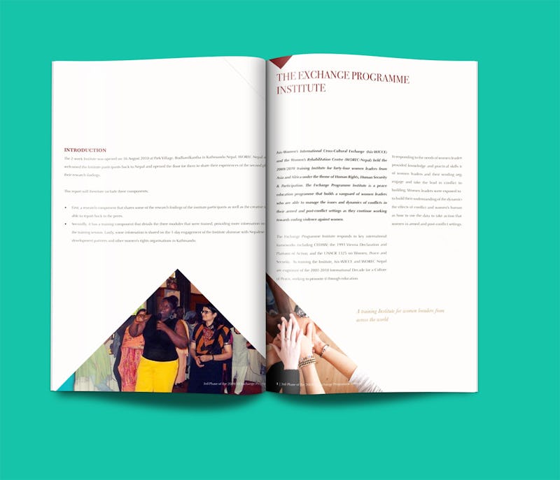 Isis-Women’s International Cross-Cultural Exchange (Isis-WICCE) and Women’s Rehabilitation (WOREC) Nepal conducted the third phase of the 2009/2010 International Exchange Program Institute for participants from twelve countries stressing the importance of highlighting the strengths of women which can be used to address various issues faced by women during and after conflict. Addmaya was approached to conceptualize and design a report layout representative of the outcomes of the third phase including testimonies, presentations and training sessions. The layout rides off two concepts i.e. Conflict and Exchange, which were both conveyed using graphic elements like crosses, grungy artwork, sharp shapes and bright red tones.